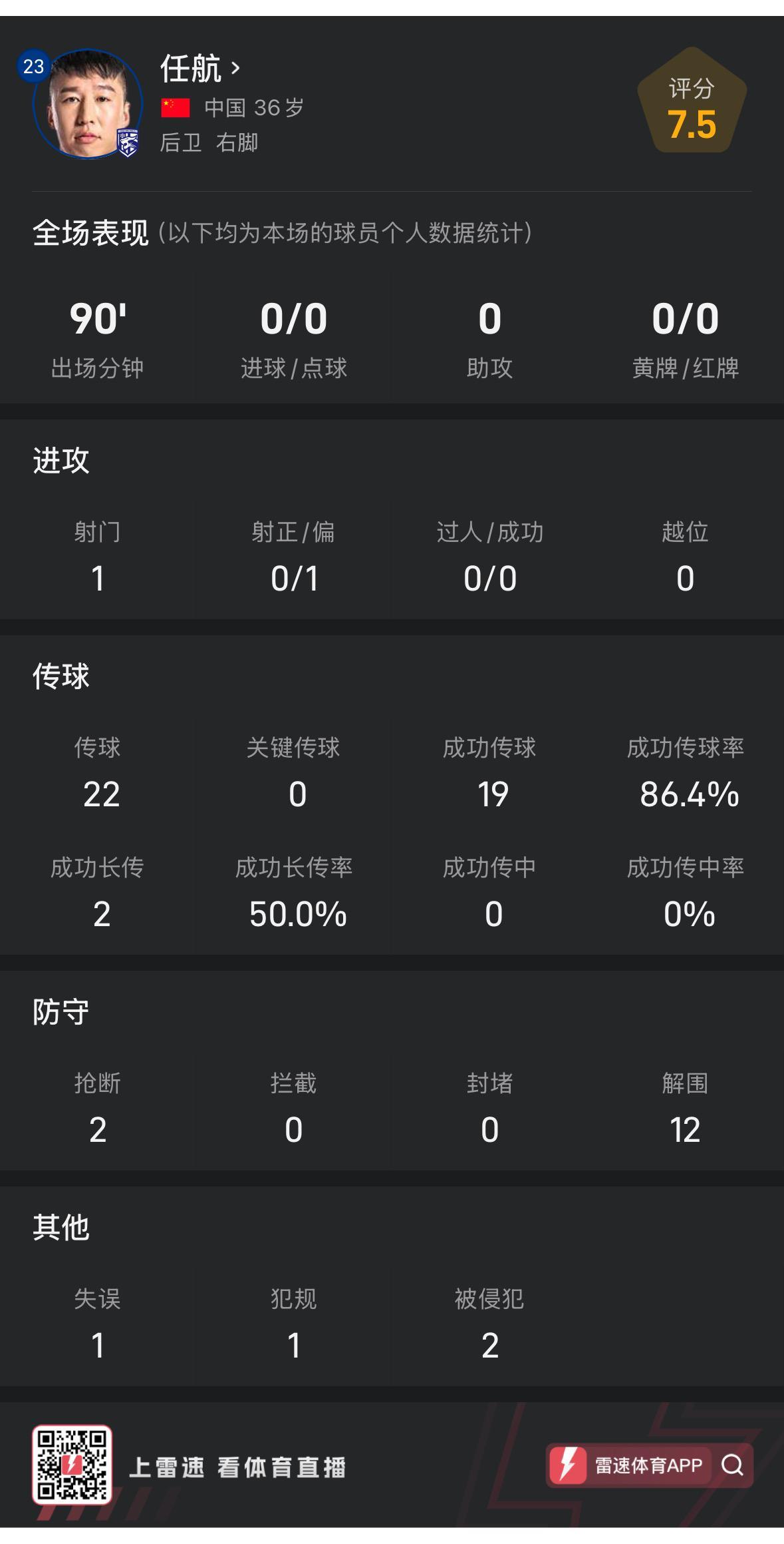 本场比赛,36岁的老将任航首发打满全场,表现抢眼的他最终帮助三镇力保城门不失。